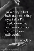 I’m writing a first draft and reminding myself that I’m simply shovelling sand into a box so that later I can build castles.